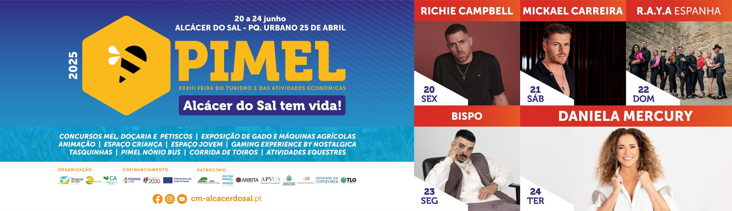 A ter lugar entre 20 e 24 de junho de 2025, no Parque Urbano 25 de Abril, em Alcácer do Sal, a PIMEL vai apresentar em palco Richie Campbell, no dia 20, Mickael Carreira, no dia 21, R.A.Y.A., no dia 22, Bispo, no dia 23 e Daniela Mercury, no dia 24 de junho.