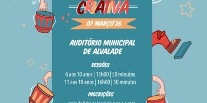 Realiza-se no dia 7 de março, um Ateliê de Percussão Criativa com duas sessões: 6 aos 10 anos, às 15h00, e dos 11 aos 18 anos, às 16h00, no Auditório Municipal de Alvalade.