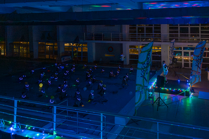 Esta é uma aula gigante de hidroginástica realizada à noite e,