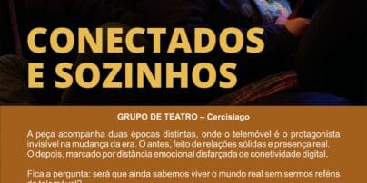 O grupo de teatro da Cercisiago apresenta a peça "Conectados e Sozinhos", no dia 13 de março, pelas 21h30, no Auditório Municipal António Chainho, em Santiago do Cacém. A peça convida-nos a refletir sobre a forma como a tecnologia mudou as nossas relações.