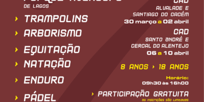 Se tens entre 8 e 18 anos inscreve-te no Desporto em Férias 2026 que decorre de 30 de março a 2 de abril, no CAD de Alvalade (engloba as freguesias de Alvalade, Ermidas-Sado, São Domingos e Vale de Água) e no CAD de Santiago do Cacém (engloba as freguesias de Abela, São Francisco da Serra e a União de Freguesias de Santiago do Cacém, Santa Cruz e São Bartolomeu da Serra), e de 6 a 10 de abril, nos CAD´s de Cercal do Alentejo e de Santo André.