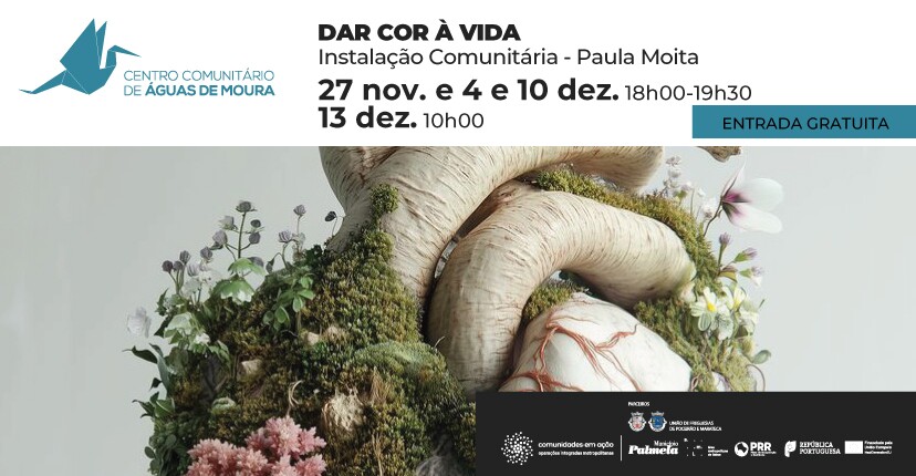 O Centro Comunitário de Águas de Moura recebe, em novembro e dezembro, o projeto “Dar Cor à Vida - Instalação Comunitária”. Com orientação da Formadora Paula Moita, esta iniciativa convida a comunidade a construir simbolicamente uma árvore imaginária - um dispositivo poético e relacional que nasce do gesto artístico e da partilha de memórias, desejos e visões de futuro.