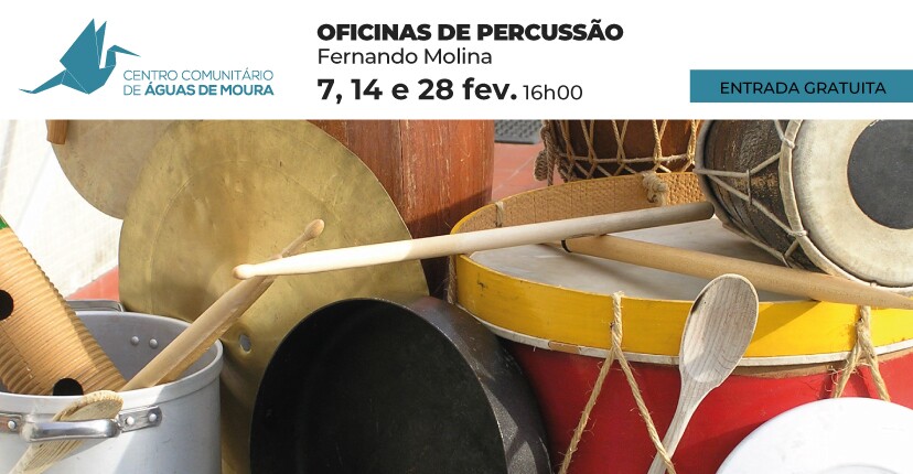 O Centro Comunitário de Águas de Moura (CCAM) recebe, nos dias 7, 14 e 28 de fevereiro, às 16h00, Oficinas de Percussão orientadas pelo formador Fernando Molina.