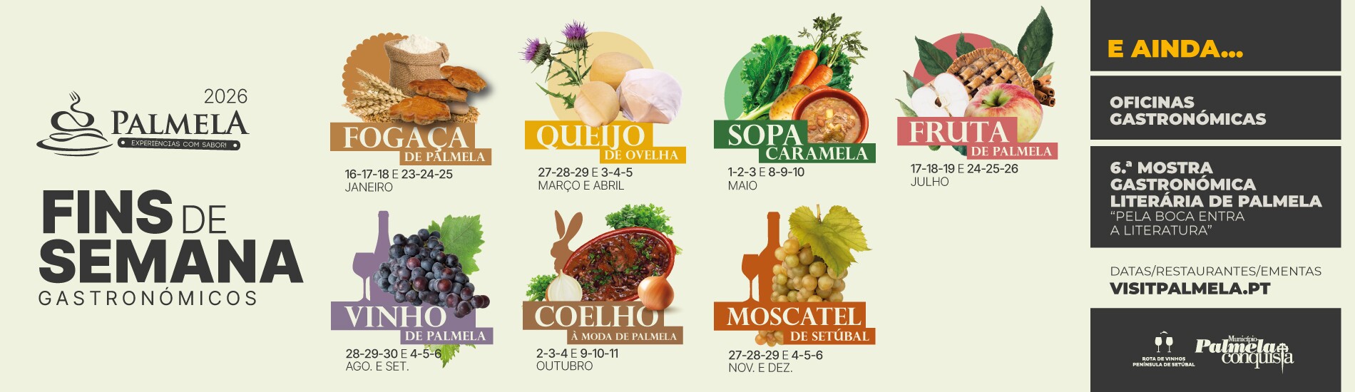 O calendário PES 2026 arrancou com os Fins de Semana Gastronómicos da Fogaça de Palmela e vai apresentar diversas propostas nos próximos meses. Destaque para os próximos Fins de Semana Gastronómicos temáticos, durante os quais os restaurantes participantes vão apresentar ementas com entradas, pratos principais, sobremesas e bebidas elaborados a partir do produto regional em destaque. As Oficinas Gastronómicas e a 6.ª Mostra Gastronómica Literária de Palmela “Pela Boca Entra a Literatura”, que alia gastronomia e cultura de forma criativa, são outras sugestões a não perder.